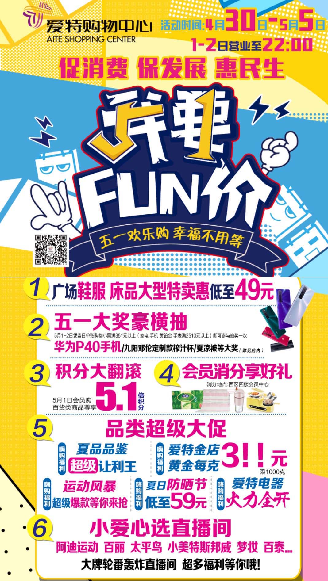 2.“五一”購物抽大獎。5月1日、2日憑當日單張購物滿351元以上小票(家電、手機、黃鉑金、手表滿2510元以上)即可參與抽獎一次。(大獎包括:華為P40手機、九陽鄧倫定制款榨汁杯、夏涼被等)