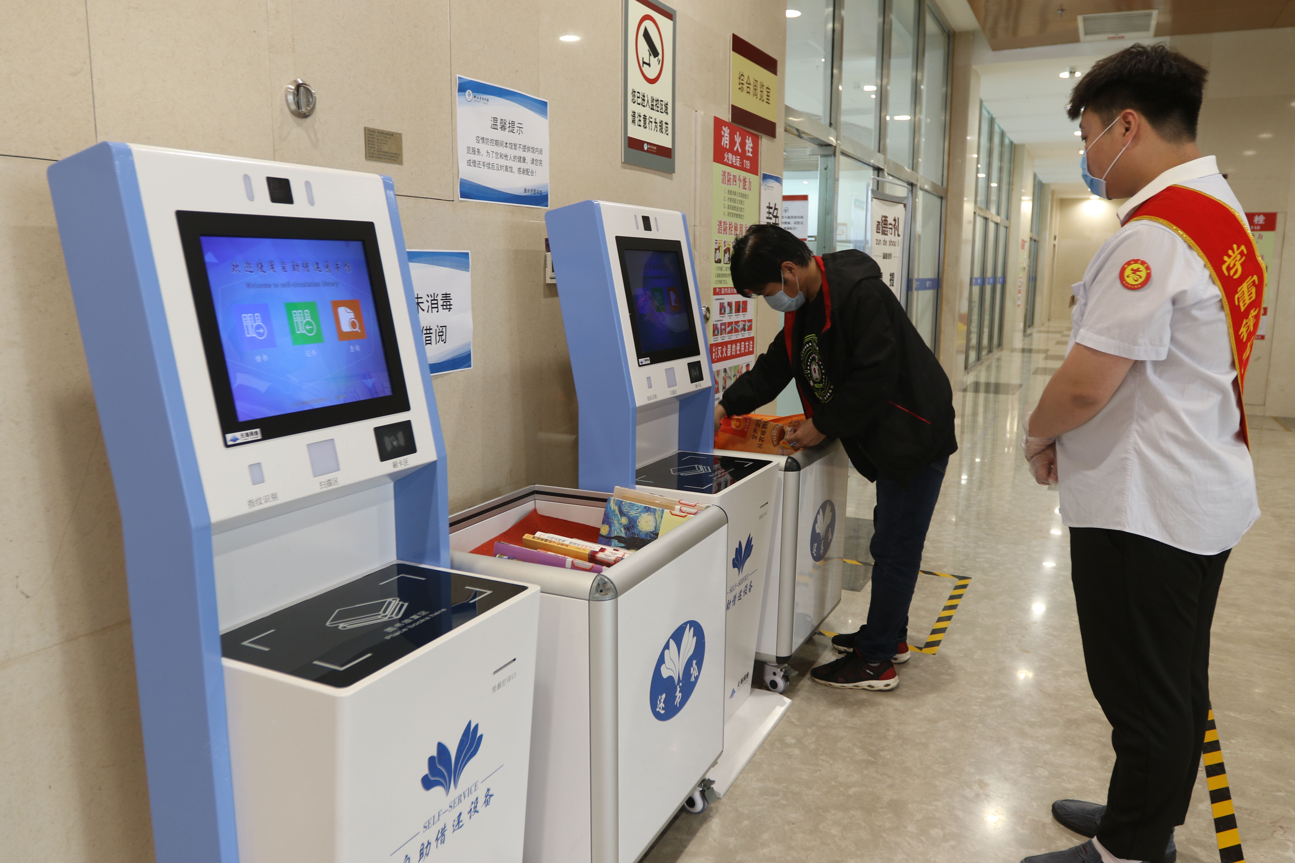 在衡水市圖書館內(nèi),讀者在自助借還設(shè)備前歸還圖書。