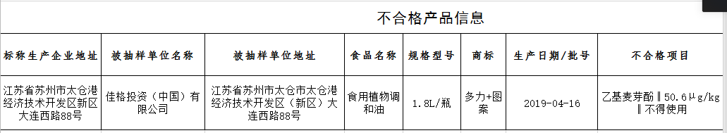 據(jù)了解,此次抽檢包含食用油、油脂及其制品樣品共48批次。新京報(bào)記者注意到,被抽檢品牌中包含益海嘉里、道道全、中糧、魯花等,僅有1批次不合格。根據(jù)通告,由佳格投資(中國(guó))有限公司經(jīng)銷的、標(biāo)稱佳格食品(中國(guó))有限公司生產(chǎn)的多力(臻寶)食用植物調(diào)和油(1.8L/瓶,2019-04-16),檢出禁用物質(zhì)乙基麥芽酚(50.6μg/kg),不符合食品安全國(guó)家標(biāo)準(zhǔn)規(guī)定。