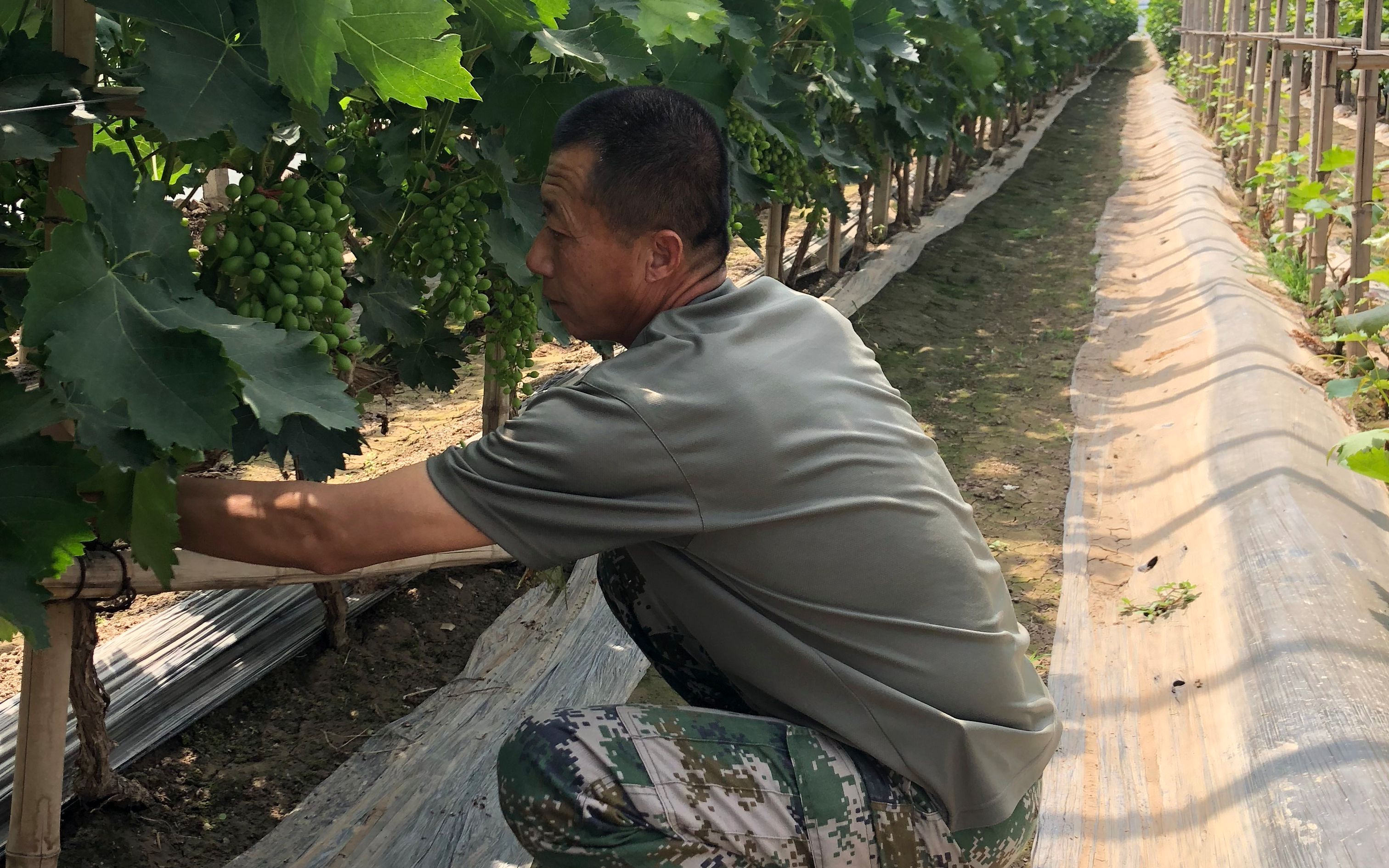 順著恒濱農業園往西走,就到了中常莊村的葡萄采摘園。一串串青綠色的“玫瑰香”壓滿枝頭,雖然還未成熟,但已陸續上色,果實整齊飽滿,極為誘人。