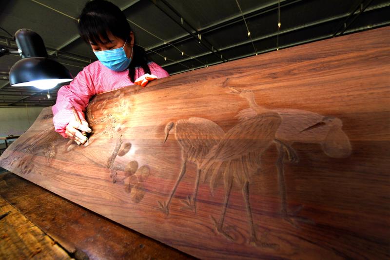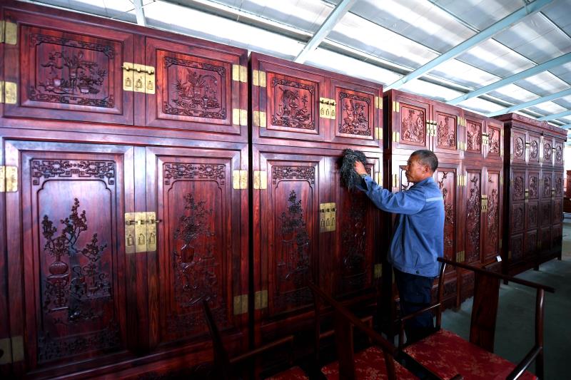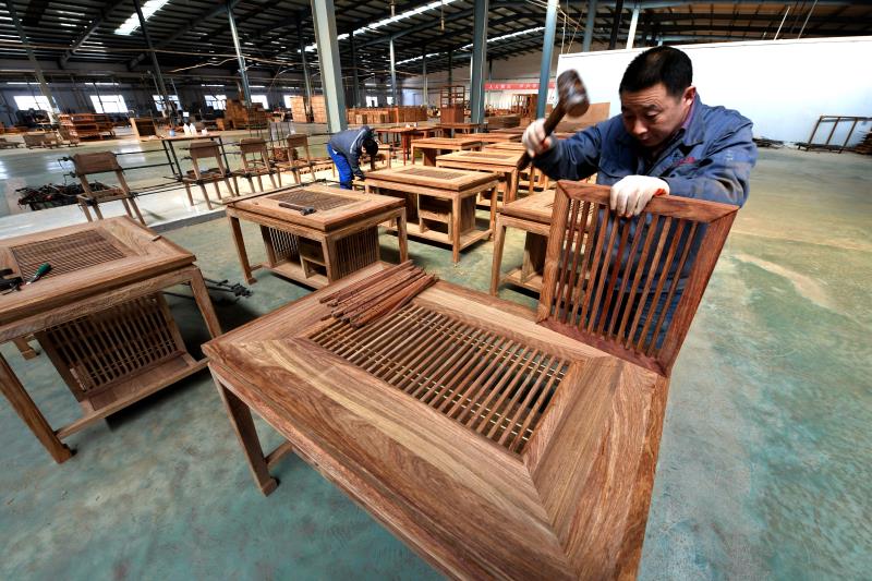 開料、烘干、刮磨、雕刻、組裝……5月26日,河北昊陽紅木家具有限公司的各個生產車間里,工人們有序忙碌著……幾十道工序、耗時3到6個月后,生長百年以上的原木將“變”成典雅精美的紅木家具。