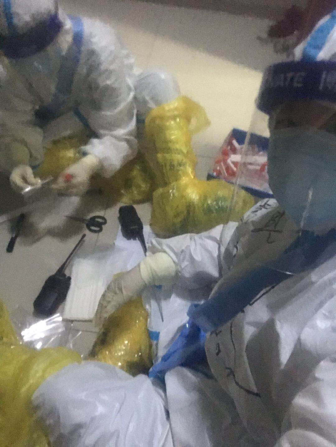 “工作人員,工作人員,聽到請回答!”還未送完餐,身側(cè)的對講機突然響了。“難道有突發(fā)情況?”心里的警鈴還未作響,命令就傳了過來:“從2層開始采集咽拭子,房間號是……”周紅懸著的心還沒來得及放下,立馬就又提了起來,“一共要采79個咽拭子!得抓緊干,不能把任務留給下個班次的隊員們。”想到這兒,周紅和安新當?shù)氐囊幻犛褞缀跏切∨苤碌搅?樓,邊跑邊做好了分工:“我采咽拭子,你貼標簽。”