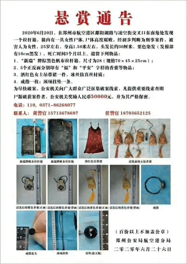 6月26日,鄭州警方發布懸賞通告稱,河南鄭州航空港區發現一具女性尸體藏匿拉桿箱,凡提供重要線索者,警方獎勵人民幣5萬元。