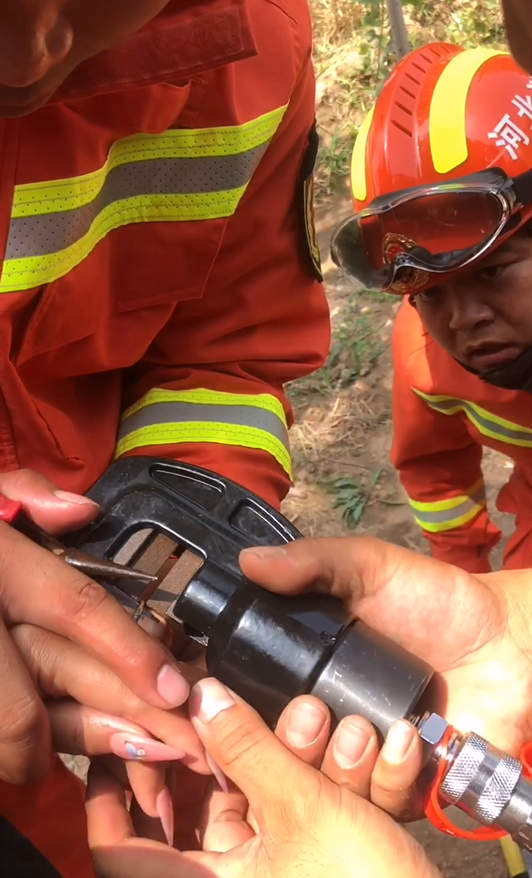 消防員詢問得知,卡手男孩頭天晚上睡前帶上了新買的網紅戒指,第二天早晨發現手指紅腫、麻木,戒指取不下來。經消防員檢查確認,戒指為不銹鋼材質,堅硬,厚度較大。男孩的右手食指被卡,已經紅腫。
