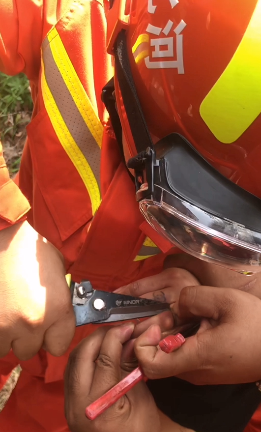 救援人員了解情況后迅速展開救援。為防止男孩手指二次受到傷害,救援人員先先用鑰匙墊在戒指與手指之間并用浸濕的毛巾覆蓋在手指周圍保護男孩的手指,隨后邊用角磨機切割邊用冷水降溫,經過細心操作,戒指被切斷,救援人員隨后用兩把鉗子夾開戒指,然后用一枚鑰匙墊在手指下方,順著鑰匙將戒指取出。