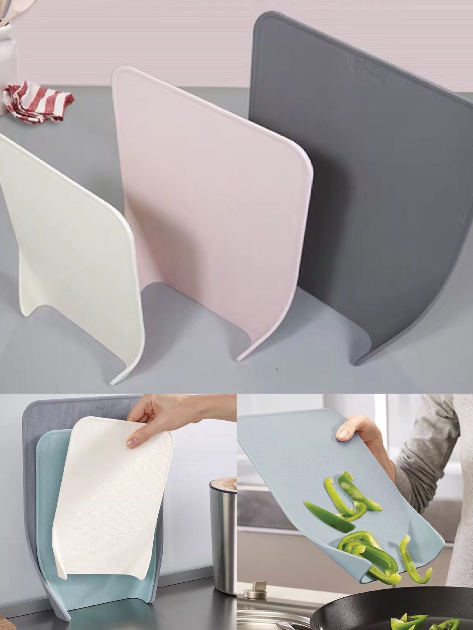 潮濕的夏天,清洗后的砧板一定要晾干才能保持清潔衛(wèi)生。這款Joseph Joseph的砧板就能自己“站住腳”,方便晾干收納。下部的卷邊設(shè)計不但是它站穩(wěn)的基礎(chǔ),切菜后也可以十分方便地倒進炒鍋。不在廚房墻面上釘釘子、粘掛鉤,這套砧板真心做到了“不扶墻就服它”。