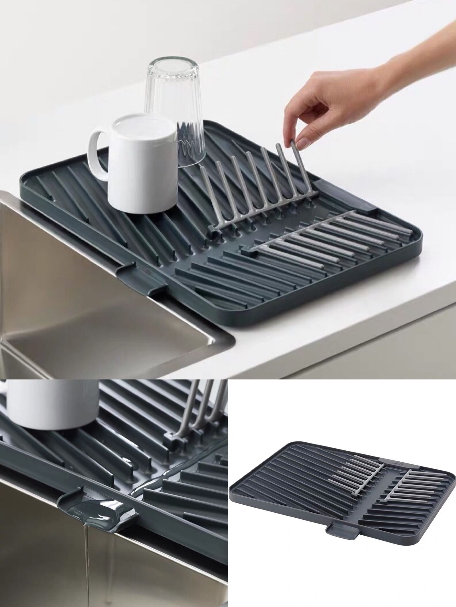 各種碗碟杯盤,一架搞定。這個支架,立起來可以一次性瀝干6個盤子,放下去則可以放杯子、碗。獨特的引流槽設(shè)計,可以讓碗架中的積水直接引到排水口、流進洗碗池。防滑的底墊在使用時也更加穩(wěn)固。