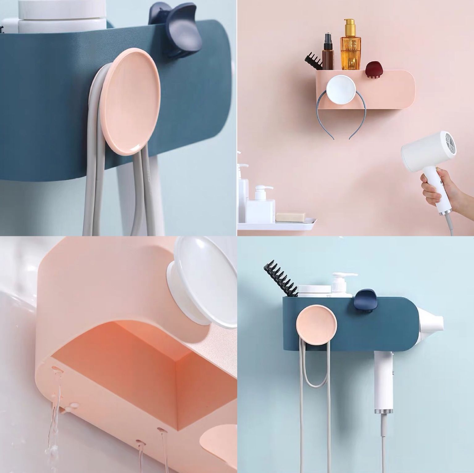 吹風(fēng)機、梳子、發(fā)卡……各種物件讓本來面積就不大的衛(wèi)生間看著非常雜亂。有了這個收納架,吹風(fēng)機可以“隱形”懸掛,就連電線都不再凌亂,其他“小零碎”也都可以各歸其位。4孔瀝水拒絕積水滋生細菌,免打孔直接粘貼的安裝方式也省去不少麻煩。