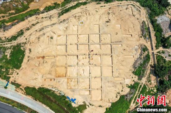 7月14日,航拍位于廣東省廣州市的中新知識城北起步區馬頭莊先秦遺址。廣州市文物考古研究院13日通報,中新知識城北起步區馬頭莊先秦遺址搶救性考古發掘,目前共清理新石器時代晚期、兩周時期墓葬65座,出土陶鼎、陶豆、陶器座、石鏟、石環、玉玦等文物107件/套。 (中新社記者 陳驥旻 攝)