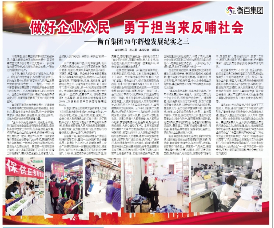 “落其實者思其樹,飲其流者懷其源。”在70年的發(fā)展過程中,衡百人一直把自己定位為一個企業(yè)公民,積極踐行社會責任。對消費者,衡百是新的生活方式引領者,致力于改善消費者生活品質,以持續(xù)的優(yōu)化和創(chuàng)新發(fā)展,營造多元化、全方位的豐富消費體驗,提供高質、超值、安全的商品和服務;對員工,衡百是大部隊、大家庭,努力成為員工價值最大化的零售企業(yè);對合作伙伴,衡百是資源的組織者,通過終端優(yōu)質平臺的打造,促進整體資源的有效組織,最終建立“共贏”的戰(zhàn)略伙伴關系;對社會,衡百是品牌與信任,堅持承擔社會責任,是優(yōu)秀企業(yè)公民的有力代言。