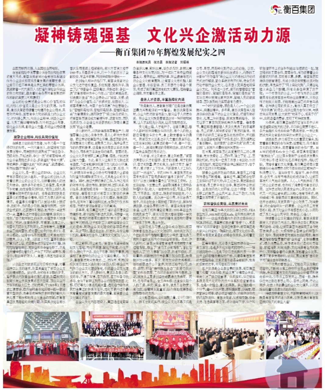企業的社會責任是企業核心價值觀的體現,而核心價值觀又是企業文化的靈魂。70年來,衡百決策者持續著力構建符合企業特點、具有時代特色、富有競爭力和創新活力的企業文化,對內凝心聚力,構筑企業精神,創造企業價值、為員工提供精神指導;對外樹立企業形象,強化企業品牌,彰顯企業力量,引領企業持續健康發展。