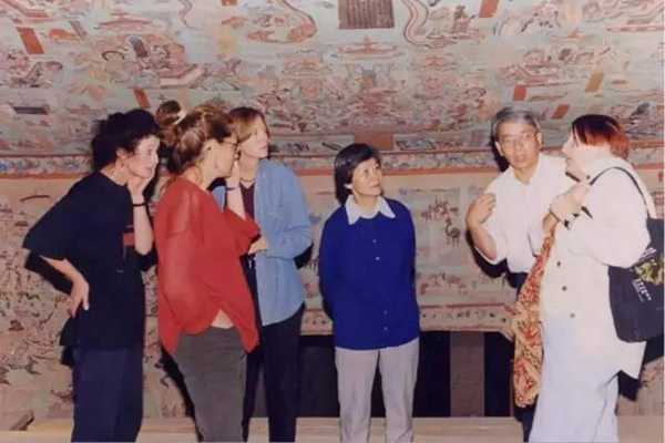 1998年,樊錦詩(shī)(左四)與外國(guó)學(xué)者探討壁畫保護(hù)方案。資料圖