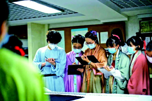 漢服商家、研究者們在中國絲綢博物館仔細記錄文物細節。(陳潤熙/攝)