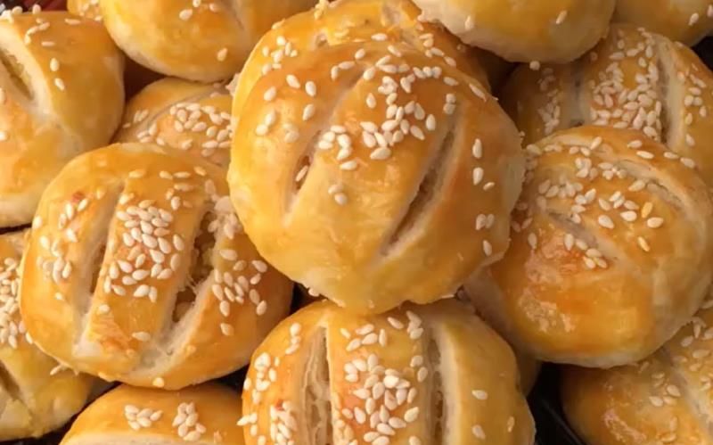 5. 將圓餅放入烤箱或空氣炸鍋中烤制,視具體情況決定烤制時間及溫度;待烤好后取出,就可以吃到會拉絲的老婆餅了。