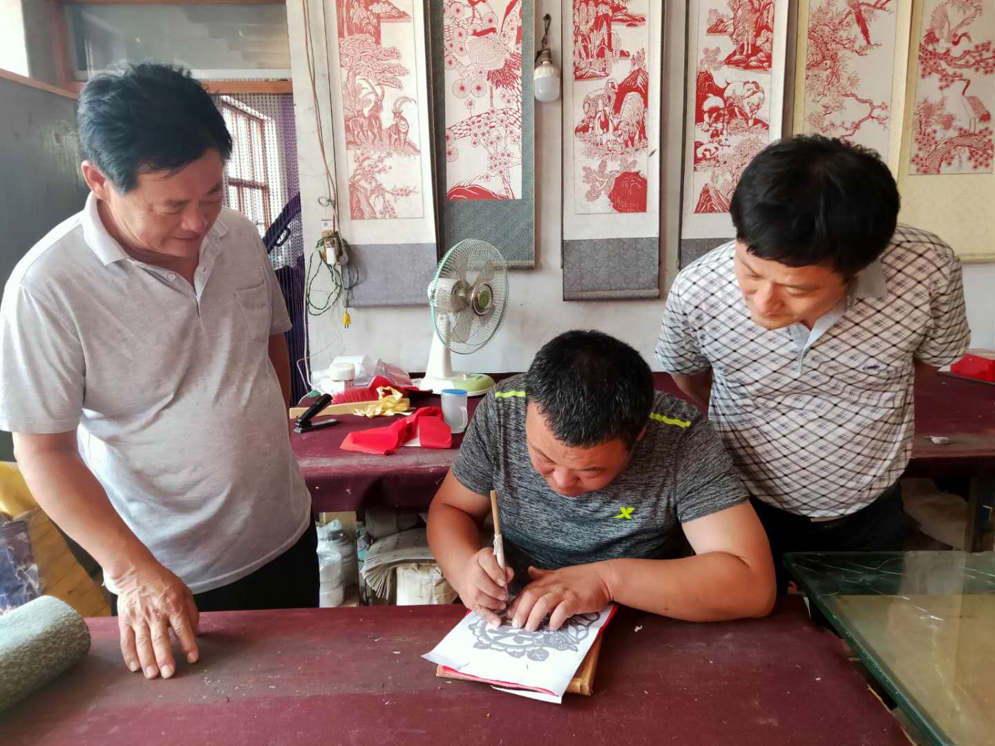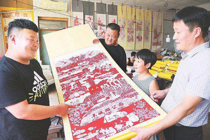 “我們村的王萬田被稱為‘阜城剪紙第一人’。”王風嶺介紹,上世紀50年代,王萬田從天津學藝回到家鄉后,通過對其它流派剪紙的潛心研究,取其精華、棄其不足,以傳統的中國繪畫為基礎,對所用工具進行改進,棄剪操刀,改為制版雕刻,形成了風格獨特的陳集剪紙。后來他將技藝傳授給鄉親們,越來越多的人加入到剪紙制作的行列。現在,200多戶的陳集村,光從事手工剪紙的就有60多戶。