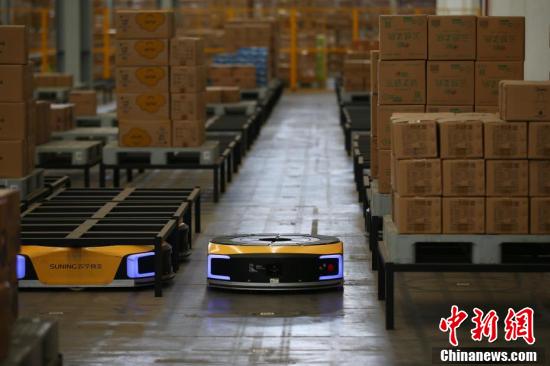 8月11日,蘇寧物流南京雨花基地5G無人倉首次對外開放。無人倉整合了無人叉車、AGV搬運機器人、機械臂、自動包裝機等眾多“黑科技”,實現了整件商品從收貨上架,到存儲、補貨、揀貨、包裝、貼標,最后分揀全流程的無人化操作。圖為AGV搬運機器人在5G無人倉進行工作。