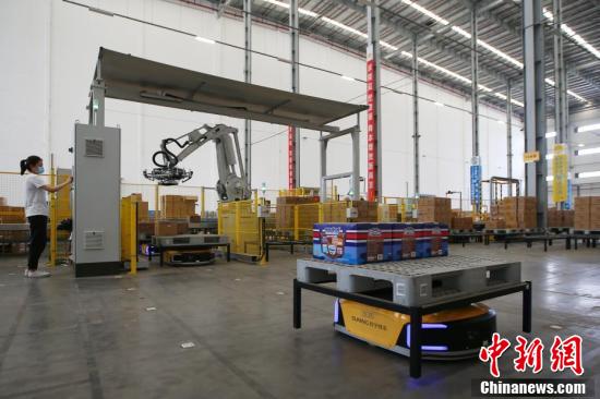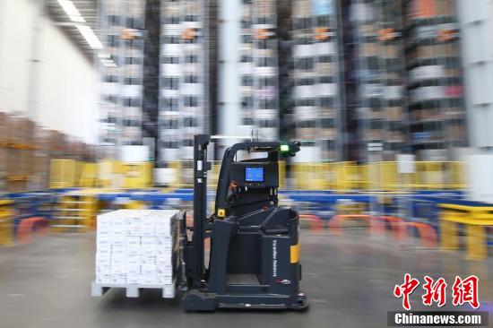 無人叉車正在搬運貨物入庫。(中新社記者 泱波 攝)