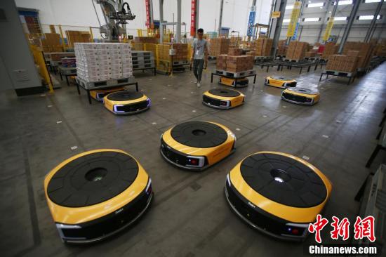 據介紹,單個機器人工作臺商品揀選效率達到了600件/小時,相比人工揀選效率提升5倍,從消費者下單到商品出庫,最快20分鐘就可完成。圖為無人叉車正在搬運貨物入庫。