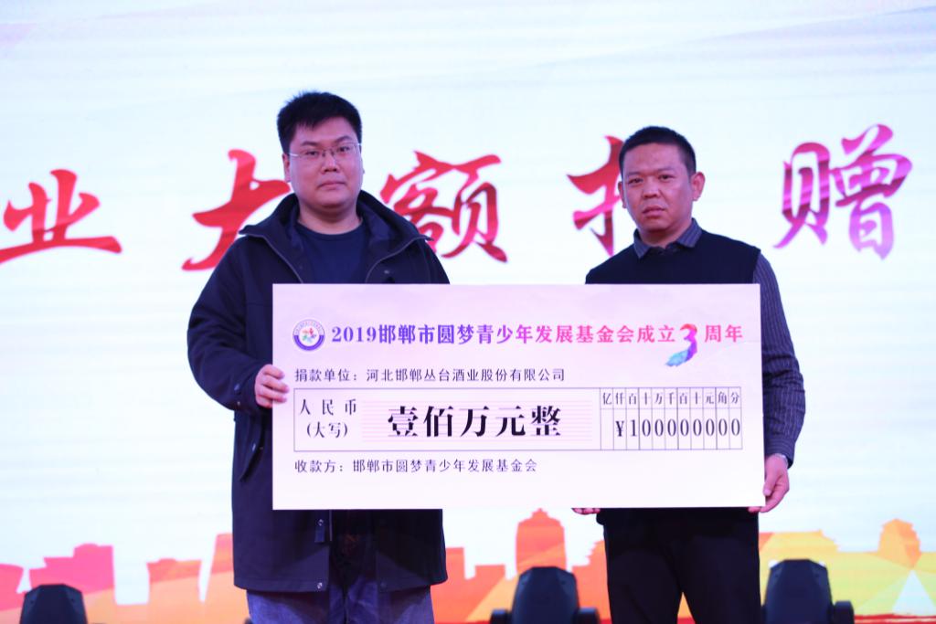 叢臺酒業(yè)于 2018 年發(fā)起成立了叢臺酒業(yè)公益基金,該基金是邯鄲市圓夢青少年發(fā)展基金會下屬子基金?;饡脑O(shè)立是叢臺酒業(yè)致力公益事業(yè)和承擔(dān)社會責(zé)任精神的傳承,也是叢臺酒業(yè)努力推動社會和諧、經(jīng)濟(jì)發(fā)展決心的彰顯。