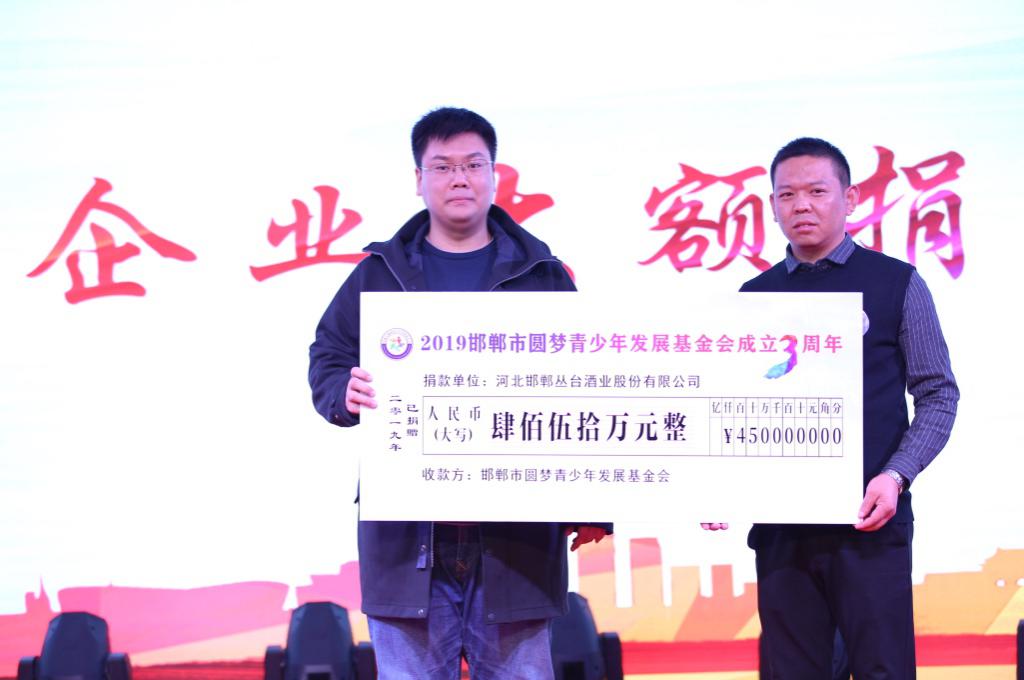 2019 年末,叢臺集團(tuán)總經(jīng)理李鵬亮(左一)代表企業(yè)向邯鄲市圓夢青少年發(fā)展基金會捐贈 550 萬元,助力邯鄲市各項公益事業(yè)的蓬勃發(fā)展