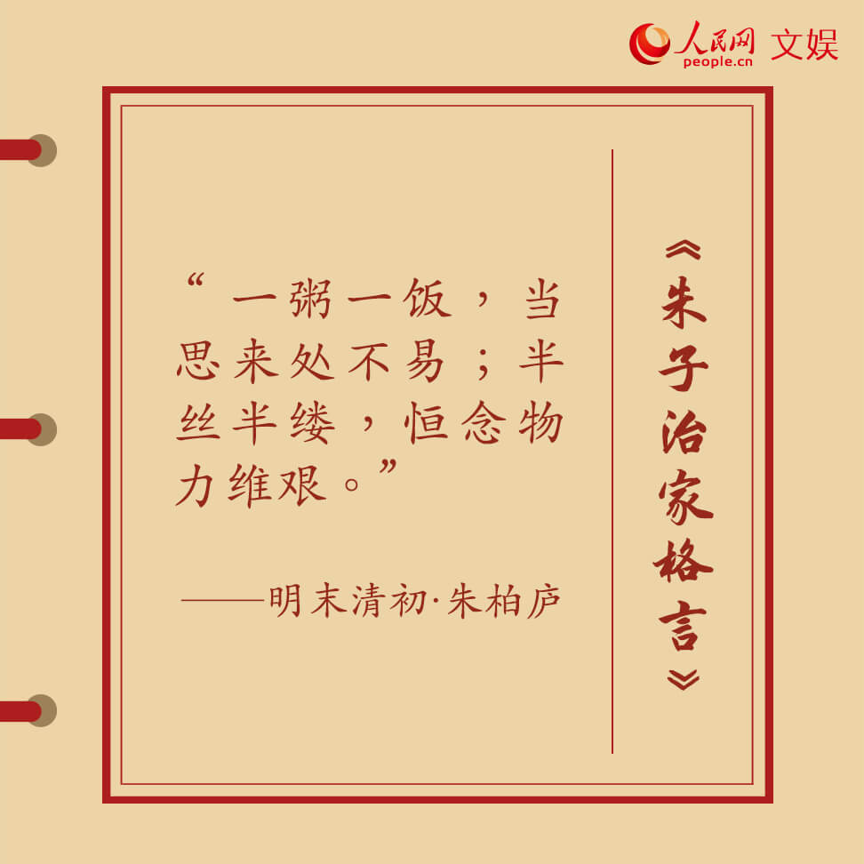 尊敬師長,勤儉持家,鄰里和睦……《朱子治家格言》是明末清初理學家、教育家朱柏廬闡明修身治家之道的著作,是古往今來頗受尊崇的啟蒙教材。文中,朱柏廬訓誡晚輩要節約糧食,勤儉行事,“一粥一飯,當思來處不易;半絲半縷,恒念物力維艱”,更是廣為引用的向儉名句。