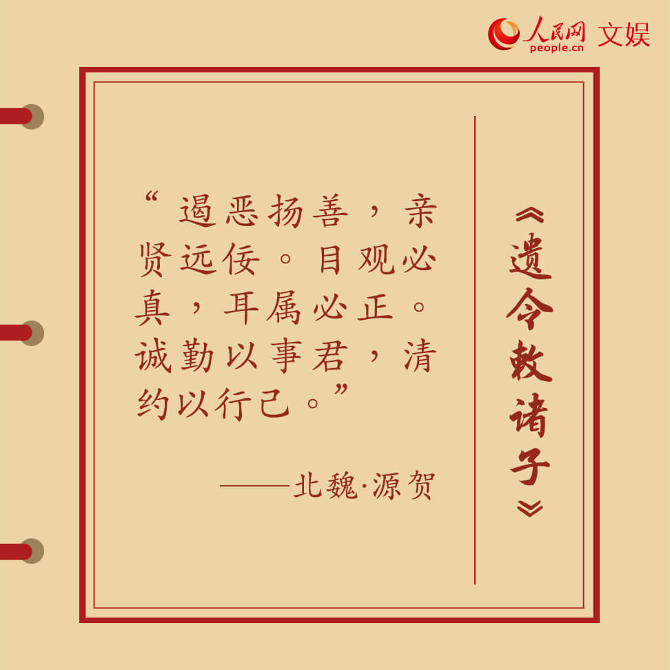 源賀是北魏名將,延興四年因病致仕時留下遺令,告誡兩個兒子為人、為官時要遏制惡行褒揚善行,親近賢人遠離奸佞;眼看耳聽,務求掌握實情;侍候君上忠誠勤勉,對待自己清正儉約。