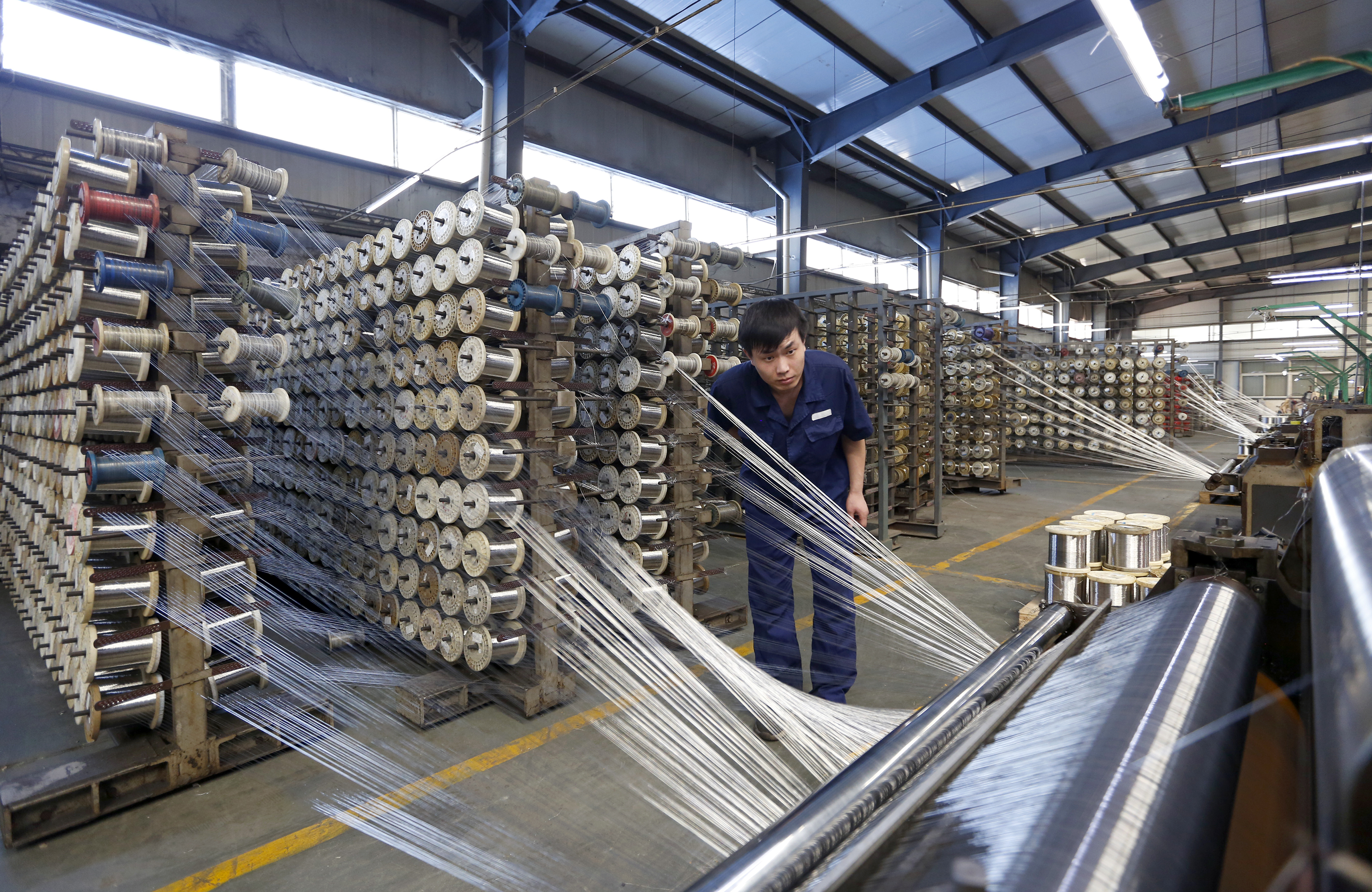 安平縣河北英凱模金屬網(wǎng)有限公司車間工人查看機械設(shè)備。