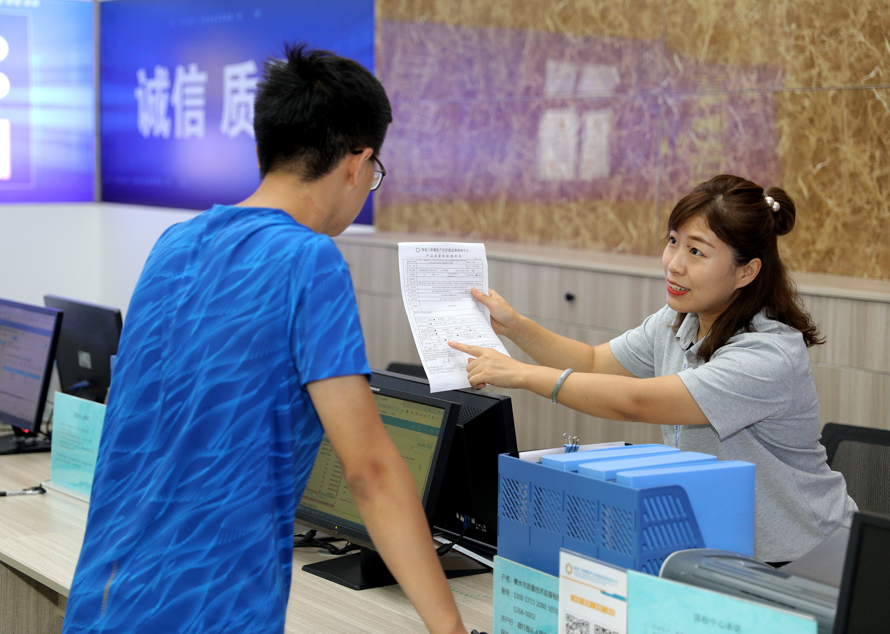 工程橡膠國檢中心服務平臺工作人員為辦事群眾答疑解惑。