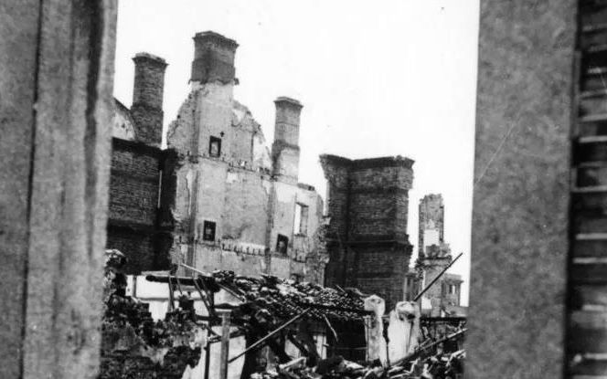 煙柱騰空而起,與低垂的烏云相接,連成一片厚重的煙墻,在殘?jiān)珨啾陂g蜿蜒,所經(jīng)之處,熾烈的火焰貪婪地吞噬著一切,將深秋十月的瑟瑟寒風(fēng)化作灼人的熱浪。但灰白的余燼,卻如凜冬的雪花一樣,帶著余溫,緩緩落在這片焦黑色的大地上。寬闊的街道變成了坑坑洼洼的小徑,小徑則被瓦礫掩埋,成了高低不平的山丘,搖搖欲圮的建筑物不時(shí)落下碎石殘磚,絕望地為這片廢墟添磚加瓦。