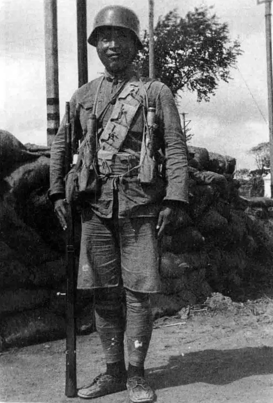 一名典型的中國士兵形象,胸前的彈藥袋里放著兩枚手榴彈。