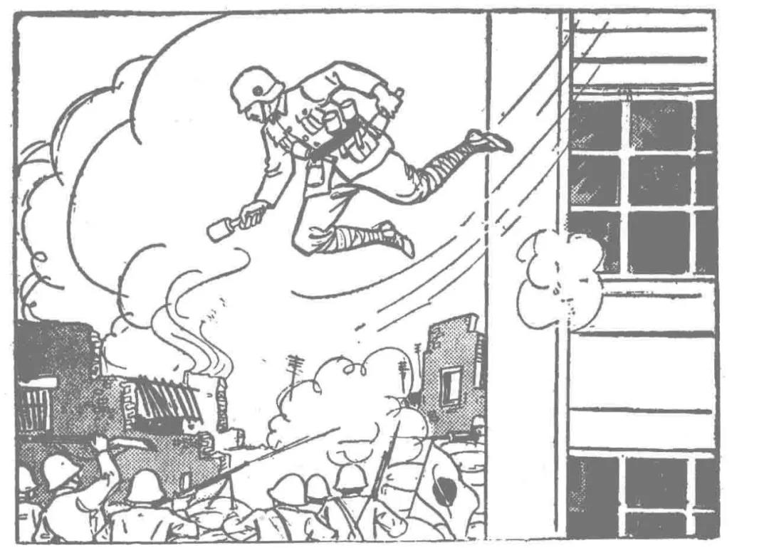 “有一個(gè)同志,很老的年紀(jì),在身邊圍了七八個(gè)手榴彈,手里也拿著一個(gè),爬到最高樓,看,看見一群敵人來了時(shí),縱身跳下,同時(shí)手榴彈也擲了出去。敵人都死了,他自己可也犧牲了。”