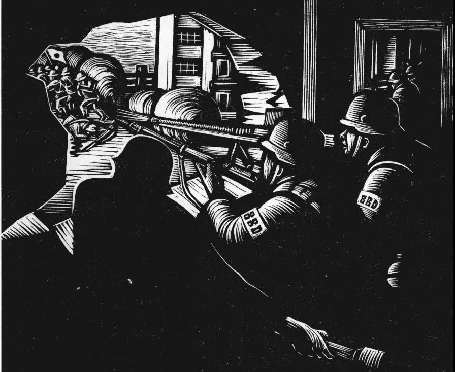 著名版畫家胡一川于1938年作版畫《八百壯士》