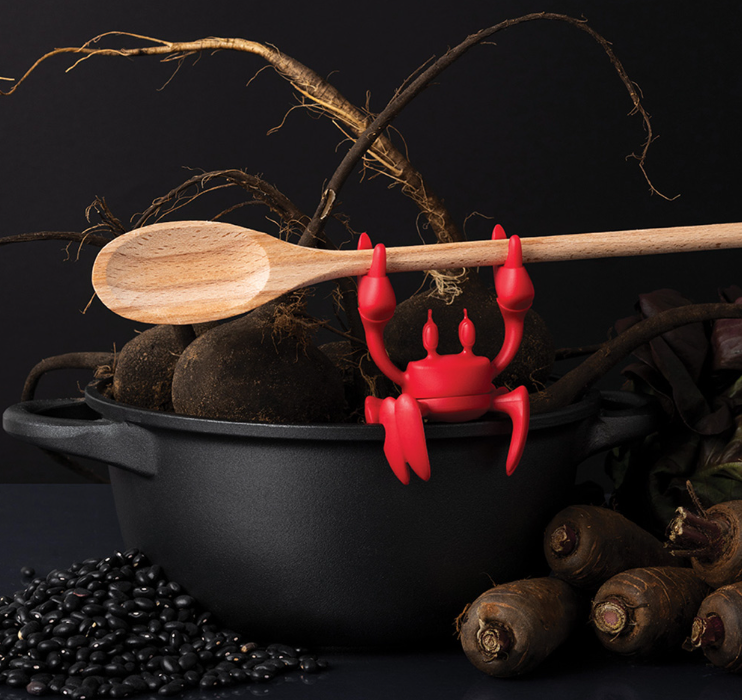 除了“小人”形的散熱器,這款螃蟹型的蒸汽散熱器也是一款別致的存在。使用時,將它放置在鍋口邊緣,鍋中水蒸氣就能方便排出。此外,它還是一款擱勺墊,它拿住勺子的樣子,有種“戰斗”的威武感。