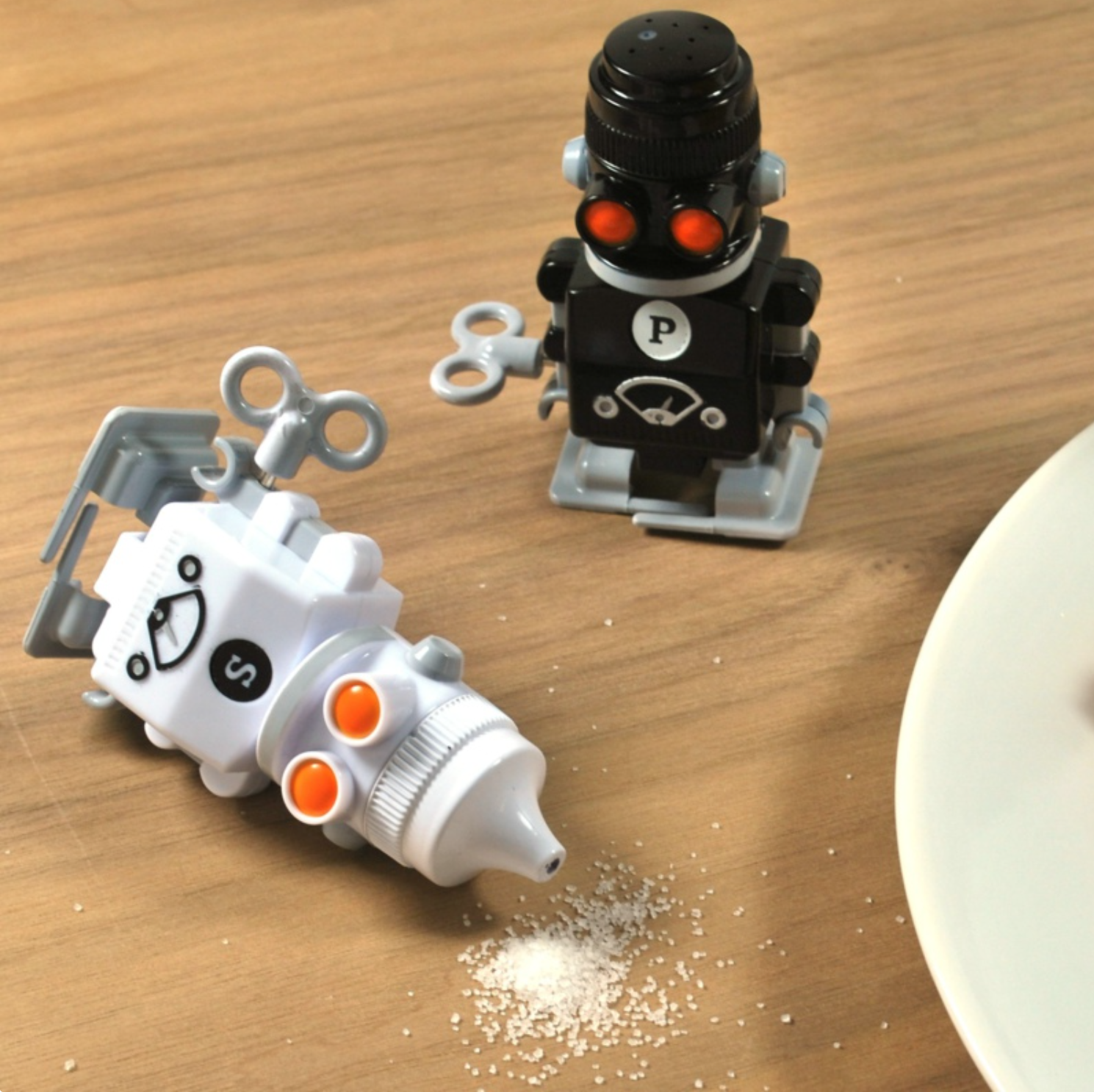 機器人的造型,像是一件小玩具,而它卻是調味瓶。擰開茶壺般的帽子,就能倒出調味品。更贊的是,這款調味瓶會動,擰緊發條再松開手,它們就能邁著小碎步,般朝著食物前進,又可愛又滑稽。
