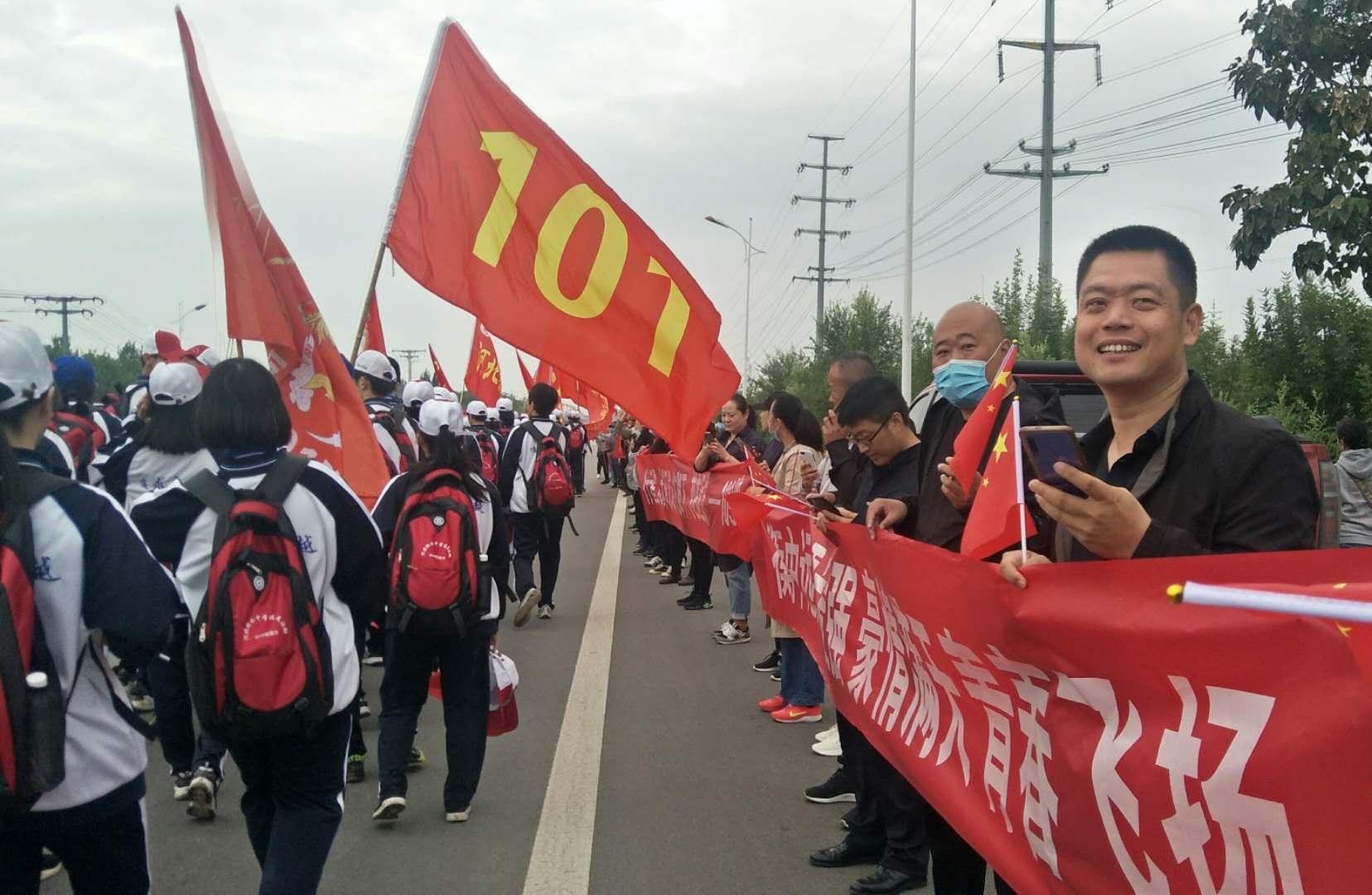 他們迎著朝陽,穿過城市和農村,越過田野和陡坡,徜徉在開滿鮮花的衡水湖健步路,最后歡呼雀躍地奔向衡水湖畔的宿營地,揮舞著國旗高唱紅歌。9月30日,衡水中學高二年級師生開展80華里遠足活動,用青春的足跡和歌聲向祖國獻禮。