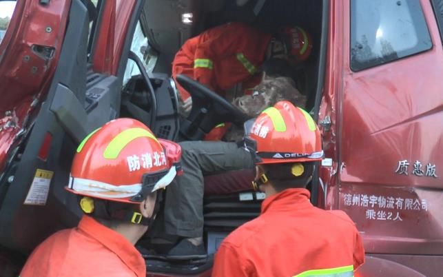 兩貨車追尾,其中一輛車駕駛員被困車內,阜城消防緊急救援,將被困者成功救出。