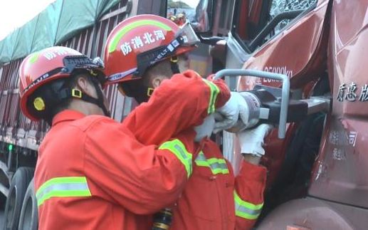 救援人員到達現場后,經現場勘查,發現追尾貨車駕駛室車門變形,前擋風玻璃破碎,駕駛室正前方被撞扁,造成駕駛員雙腿被卡在方向盤以下無法脫困。根據現場情況,指揮員立即下達救援命令:一是立即在事故現場周圍設置警戒錐,引導過往車輛,保證現場救援秩序,防止過往車輛再次發生事故;二是立即成立救援小組,在保證被困人員不受到二次傷害的前提下,利用液壓機動泵、液壓擴張器等工具對駕駛室車門進行破拆。在打開車門后,救援人員進入駕駛室,通過調整座位位置和方向盤軸承,將被困人員成功救出,交由現場醫護人員救治。