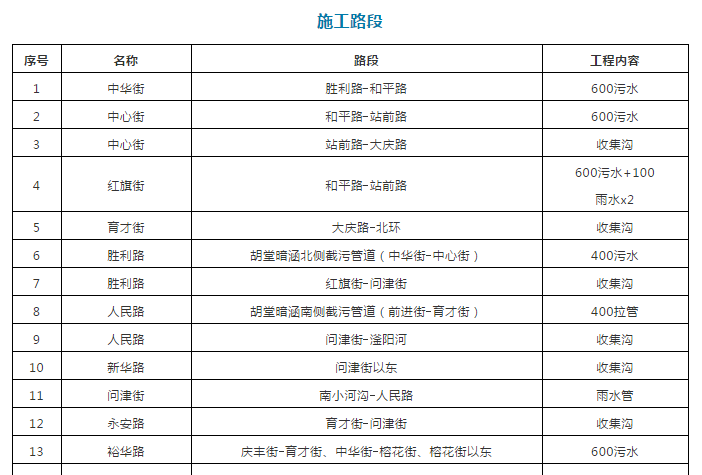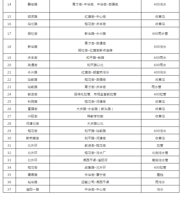 為早日實現雨污分流改造全覆蓋,近日,市排水管理中心組織施工人員對市區未實施雨污分流的多條胡同進行現場查勘,并研究制定了施工方案。即日起,將對市區中華大街勝利路至和平路路段,中心大街和平路至站前路、站前路至大慶路路段,紅旗大街和平路至站前路路段,育才大街大慶路至北外環路段,勝利路胡堂暗涵北側截污管道和紅旗大街至問津街路段等共計37個路段,以及民生胡同、民商胡同、欣平胡同、游園胡同、興平胡同等16個小胡同,進行雨污分流改造工程施工。
