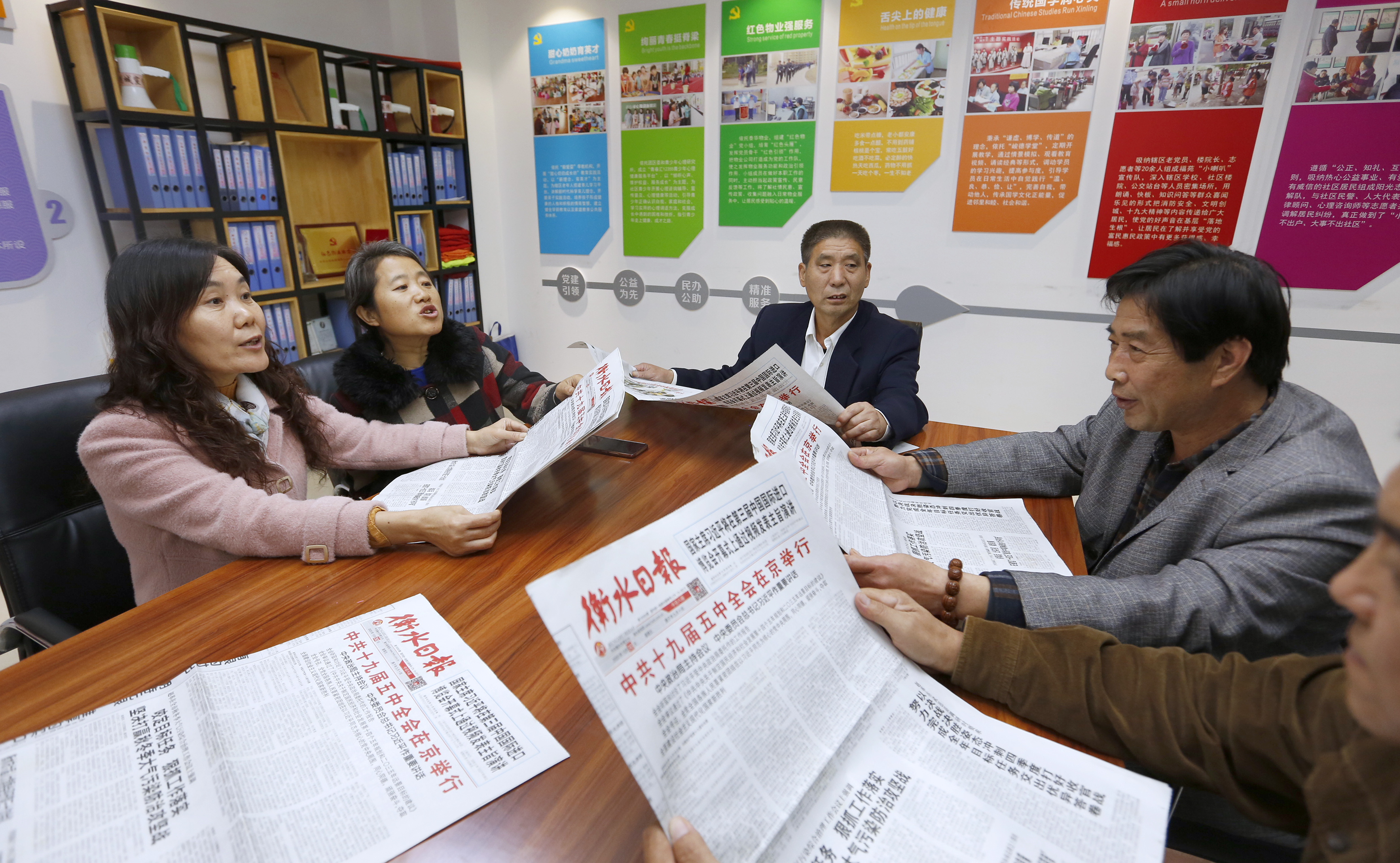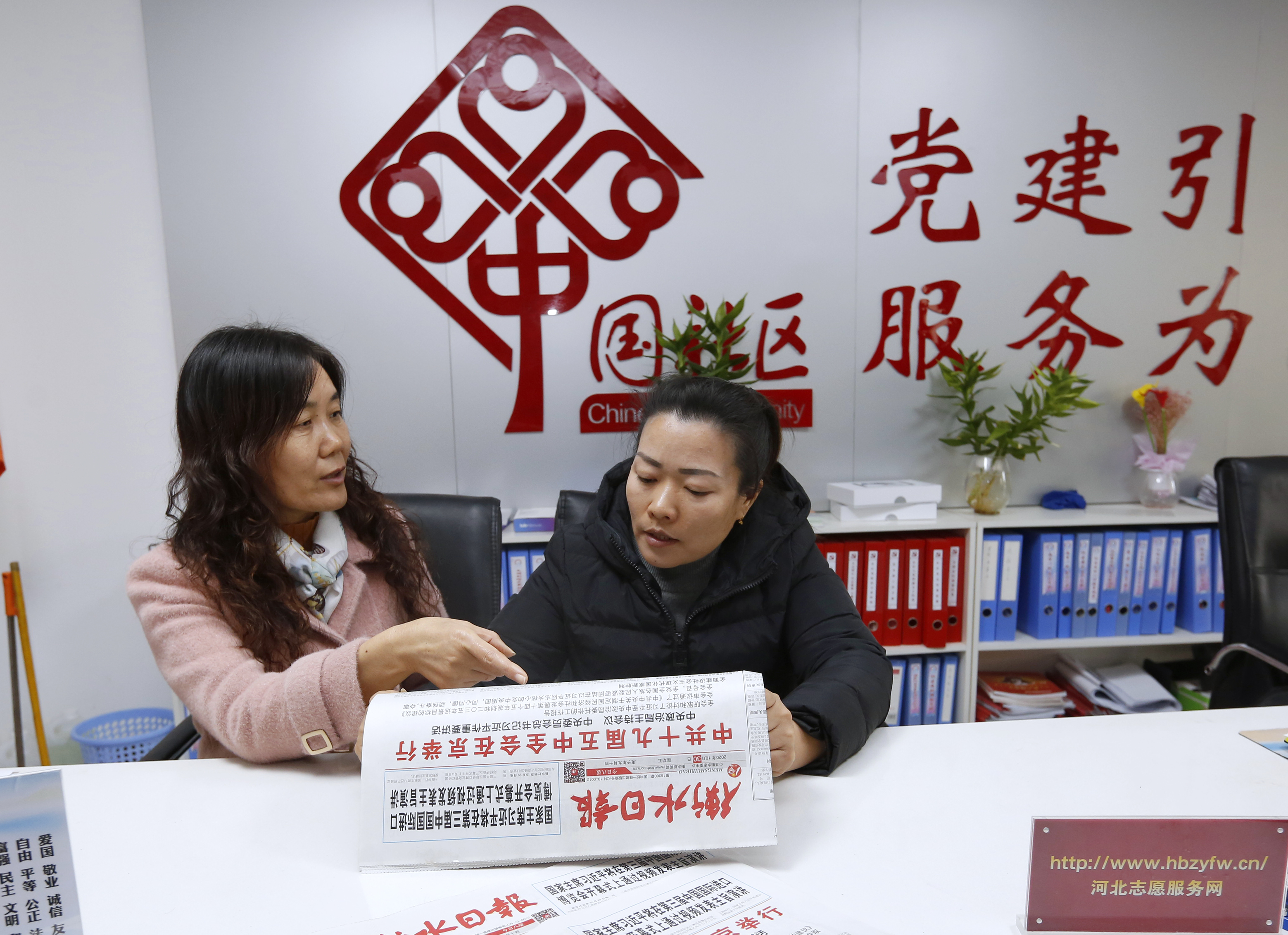 10月30日,桃城區(qū)中華街道福苑社區(qū),黨員正在閱讀十九屆五中全會(huì)相關(guān)報(bào)道。