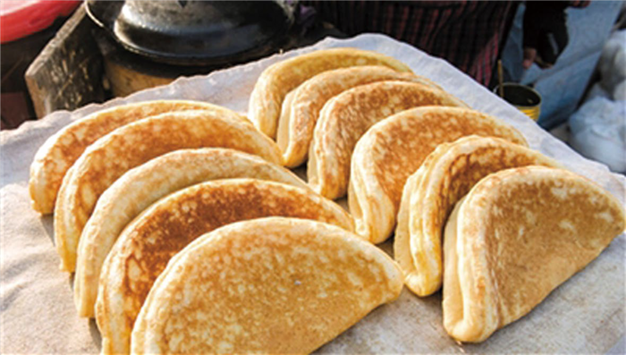 起鍋時一般會將爐糕對折一下,這時的爐糕色澤金黃、形如半月、口感松軟、味道清香,常常引起我們兄妹的哄搶。每逢大年三十,盛上一碗大鍋菜,將爐糕撕成塊狀,往碗里一泡,肉香和爐糕香交融在一起,頓時那只有過大年才能聞到的香味便溢滿整個屋子,會忍不住伸長脖子深深吸上幾口。當(dāng)時,我們那一帶流傳著一句俗語:“爐糕蘸腥湯,窮人難得?!爆F(xiàn)在回想起來,在那段物資匱乏的艱苦歲月,爐糕這種粗糧細(xì)作、凝聚著勞動人民智慧的小吃,撐起了我們貧瘠的童年,成為記憶中難得的美味。