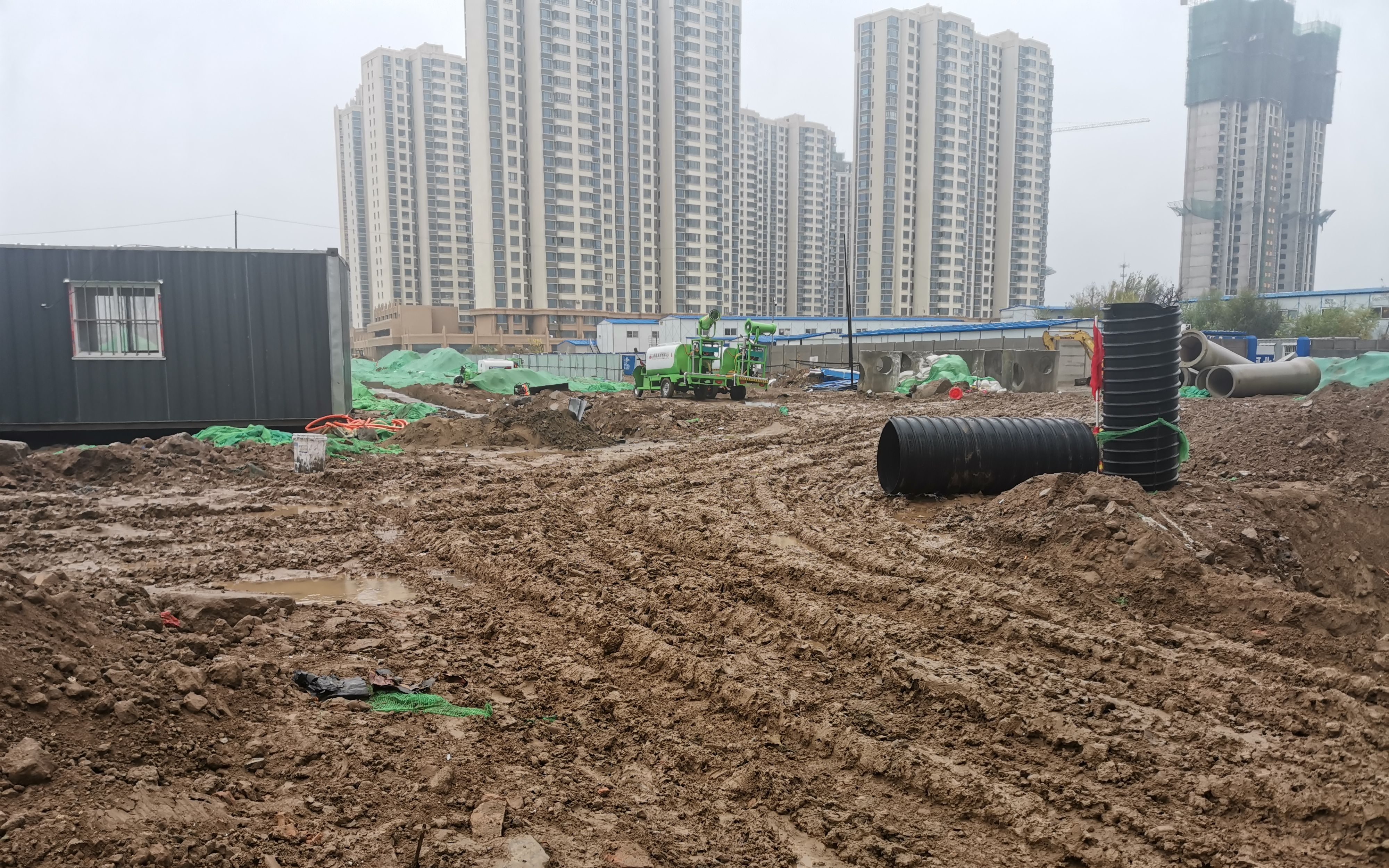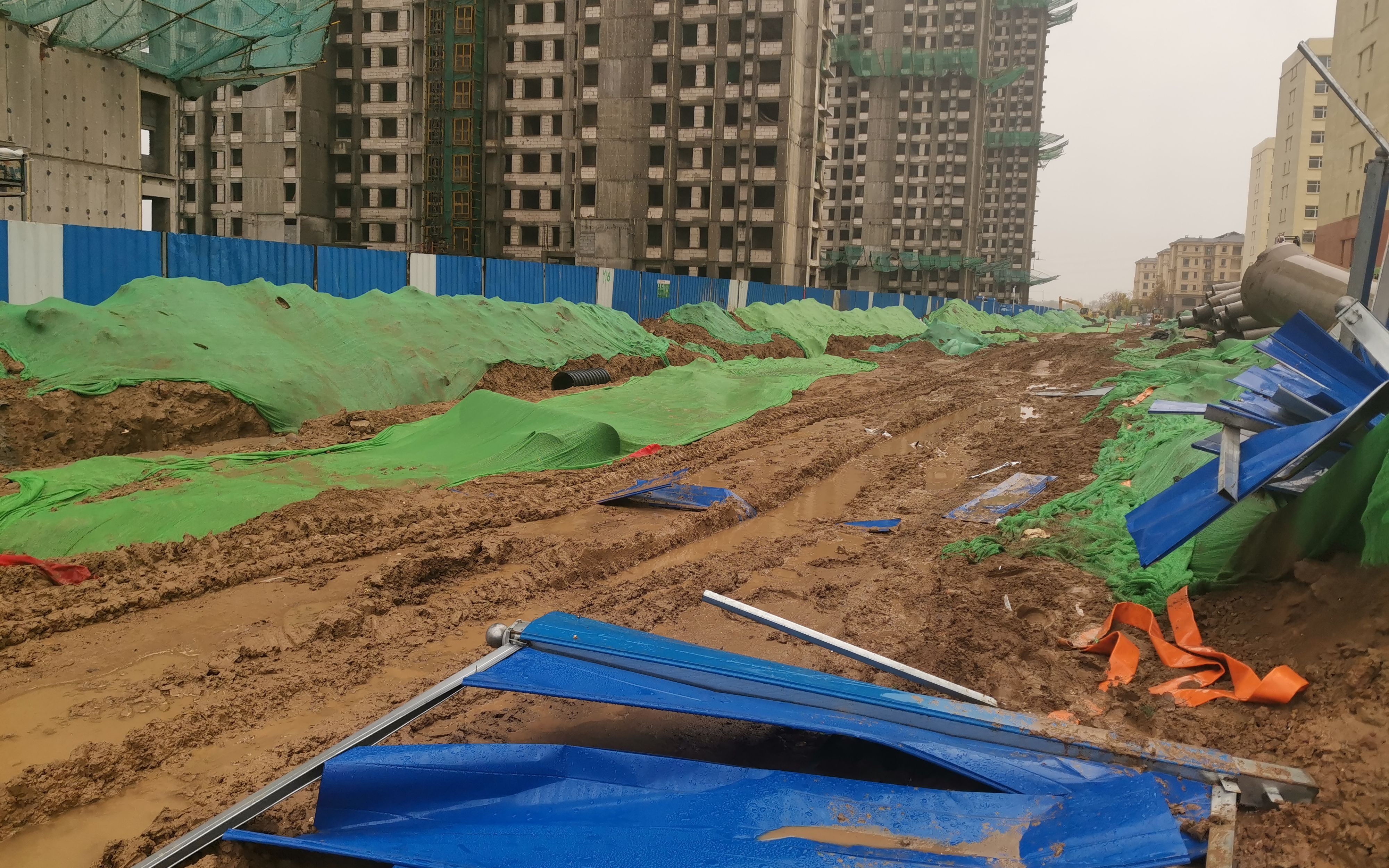 居民曹先生說,小區有北門、南門兩個門口,就在兩三個月前,兩個門口前的道路同時施工,北門口被挖出了深坑,行人只得勉強通行。而南門口則臨時開辟了一條土路,路面坑洼不平,只要有車輛經過,便會帶起厚厚塵土,行人只能往兩側避讓。如今受下雨影響,南門口成了泥潭,居民更是出入不便。