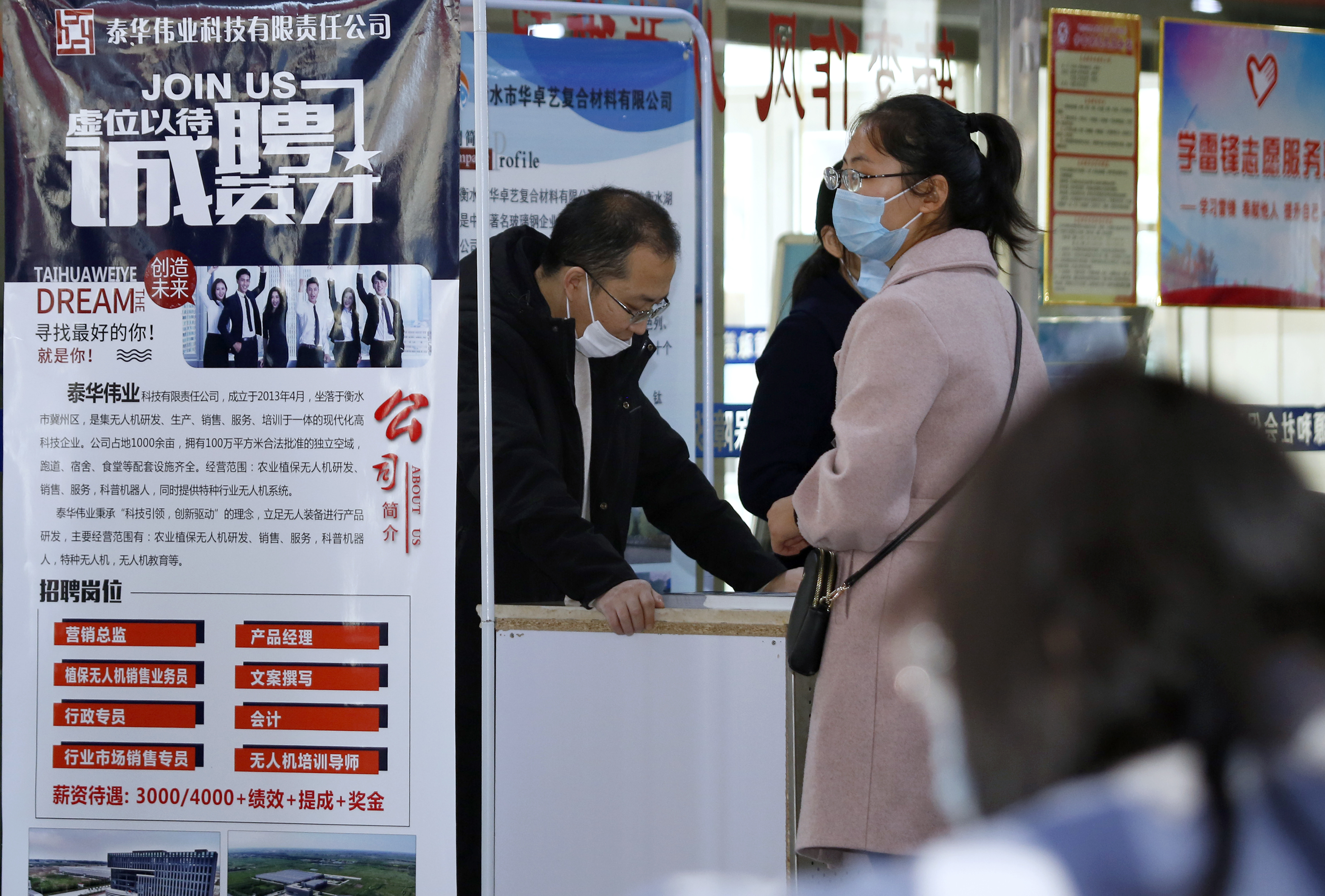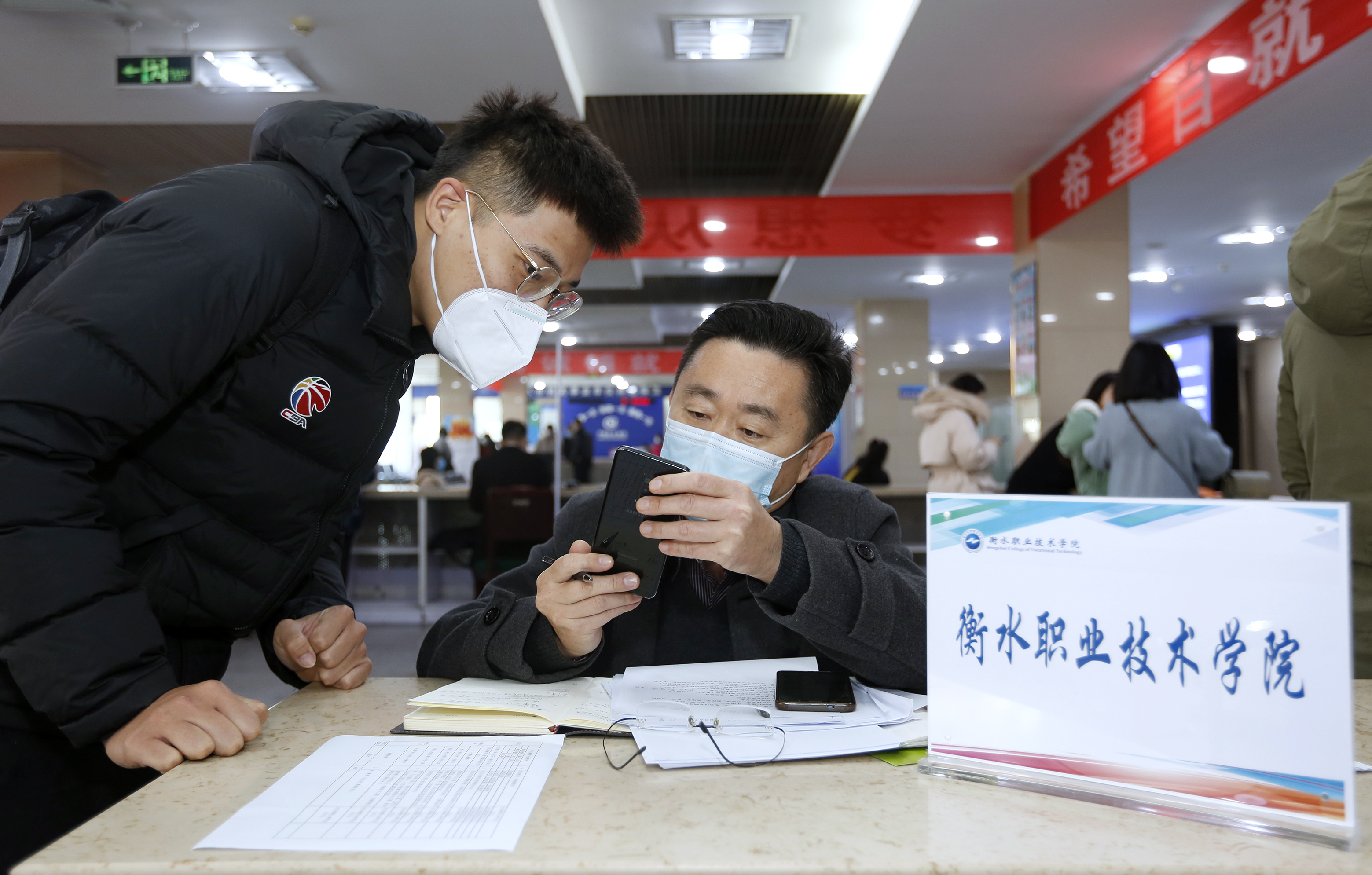 應(yīng)聘者在衡水職業(yè)技術(shù)學(xué)院展位前咨詢相關(guān)崗位要求。