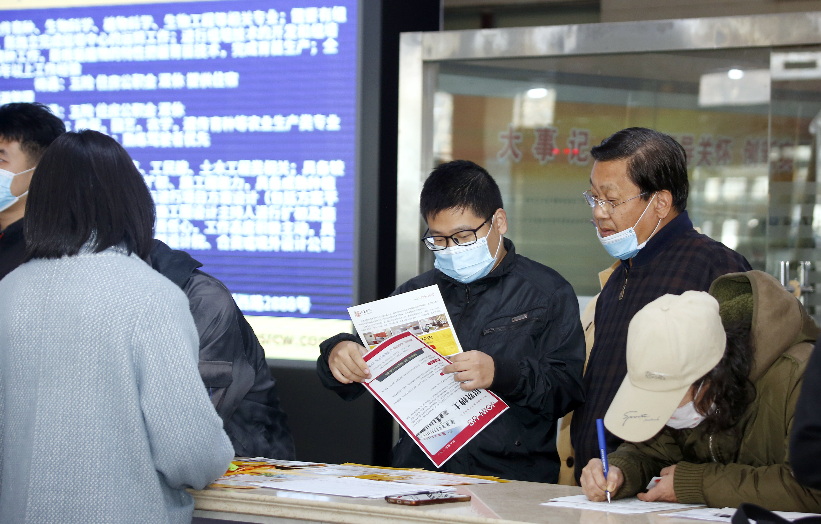 應(yīng)聘者在淵大教育展位前咨詢相關(guān)崗位要求。