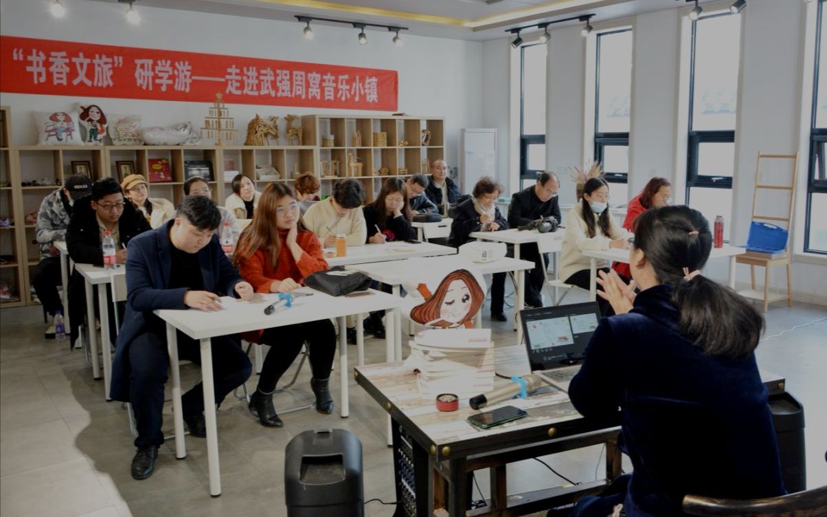 活動中,依托武強周窩音樂小鎮底蘊深厚的文化資源,衡水市圖書館以此為平臺開展了“書香文旅”研學游公益活動。圖書館工作人員與讀者一起走進周窩音樂小鎮,參觀體驗館、世界樂器博物館,用體驗式旅游讓讀者近距離接觸音樂,將文化內涵貫穿到游學過程中。當日,市圖書館還在賦格書院舉辦讀書會,與讀者共同探討如何去讀好一本書以及讀書的樂趣等話題。