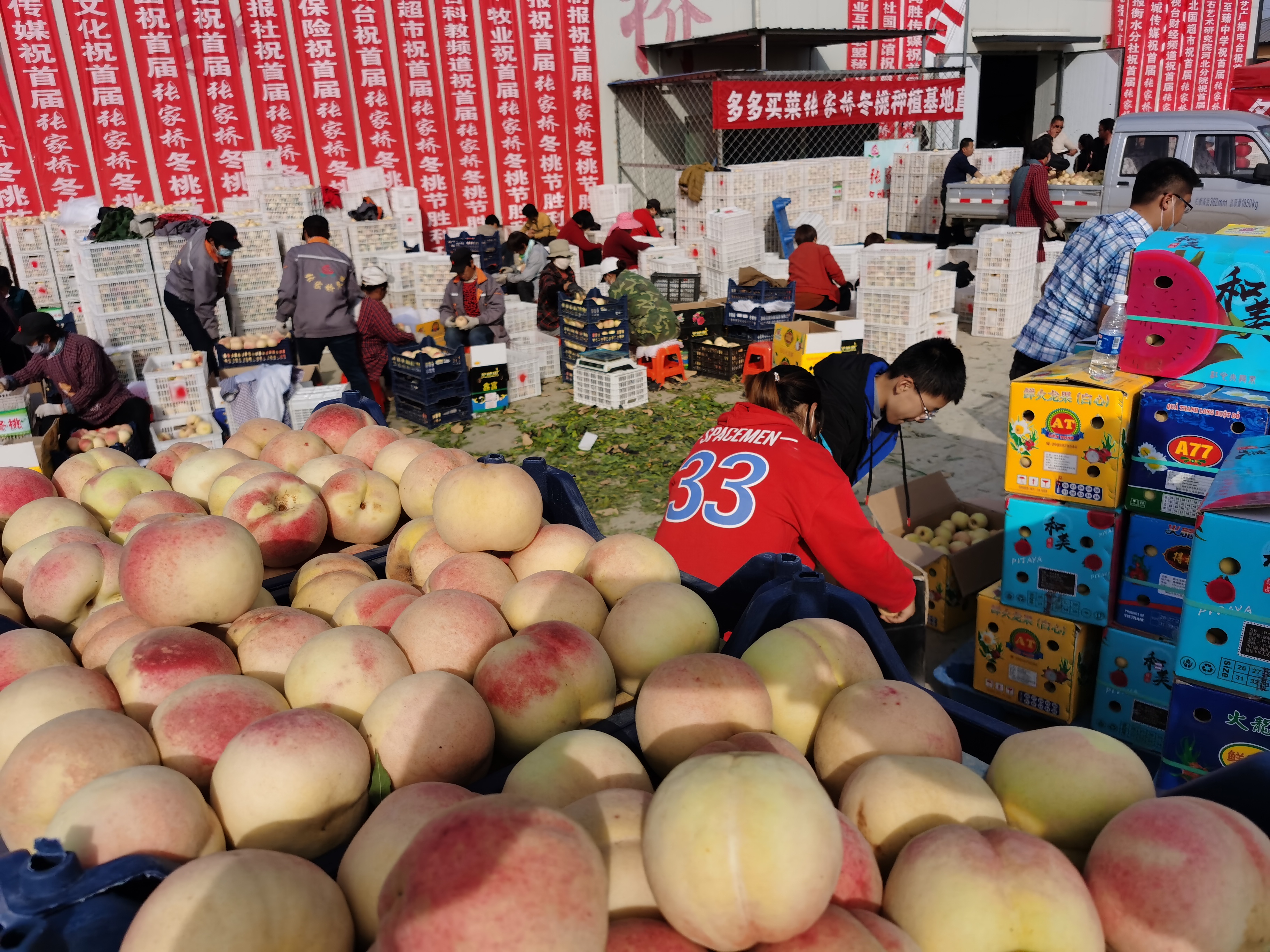 “2019年掛果前,我倆跑商超、找網紅、聯系大型批發市場,還好桃子爭氣,銷售的不錯。可來年產量又要翻幾番,我們就又帶上樣品、帶上檢測報告天南地北的跑,到上海、廊坊、昆明等地參加農博會。”看著眼前的一幕幕,王志強感慨,“誰想到今天,我們小小的張家橋,居然會因為冬桃堵車!”