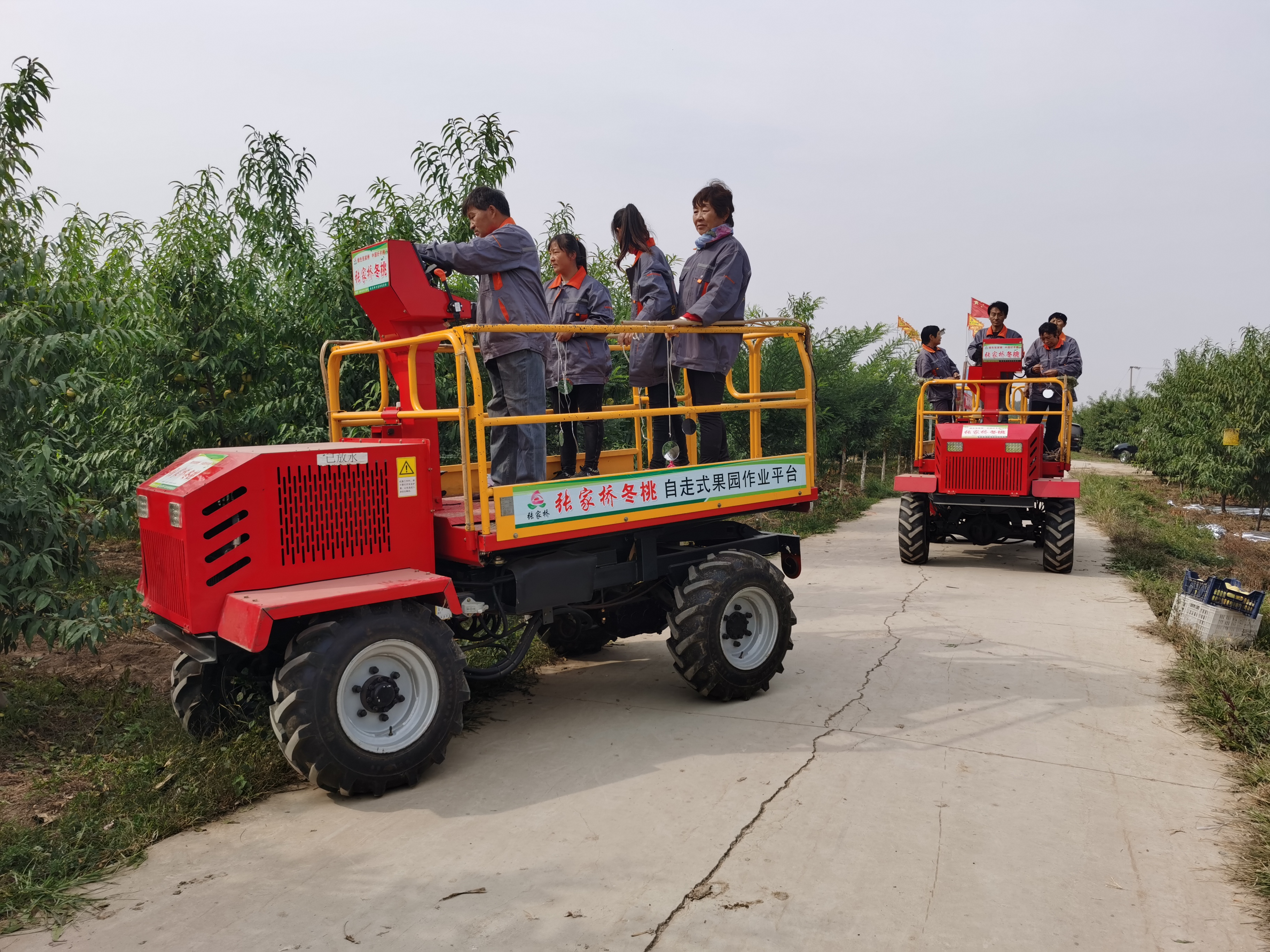 在兩個書記的帶領下,張家橋村踏上了追“桃”挖寶之旅:多次邀請北京和省市縣的農林專家來指導,聘請村里有經驗的老技術員“上崗”,帶領大家走出去學習先進的種植管理技術;落實“行長”管理制,每一行桃樹都責任到人、每一個桃都有出處;昆蟲性迷向絲、赤眼蜂、七星瓢蟲等生物防蟲新技術,振頻式太陽能殺蟲燈、粘蟲板等防蟲武器被一一引入,病蟲害“自動”遠離;自走升降式果園作業平臺、開溝施肥覆蓋一體機、自動避讓式鋤草機穿梭在桃林中,讓桃樹管理趨于機械化、科學化、標準化……