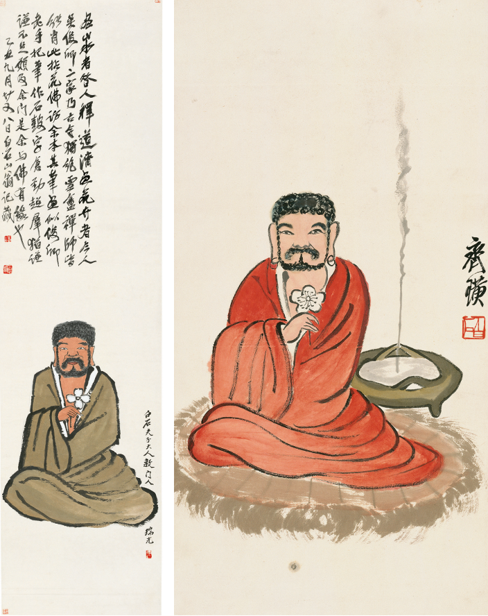 左圖:瑞光《臨白石畫佛》,1925年。北京畫院藏。右圖:齊白石《拈花微笑》,無年款。北京畫院藏。
