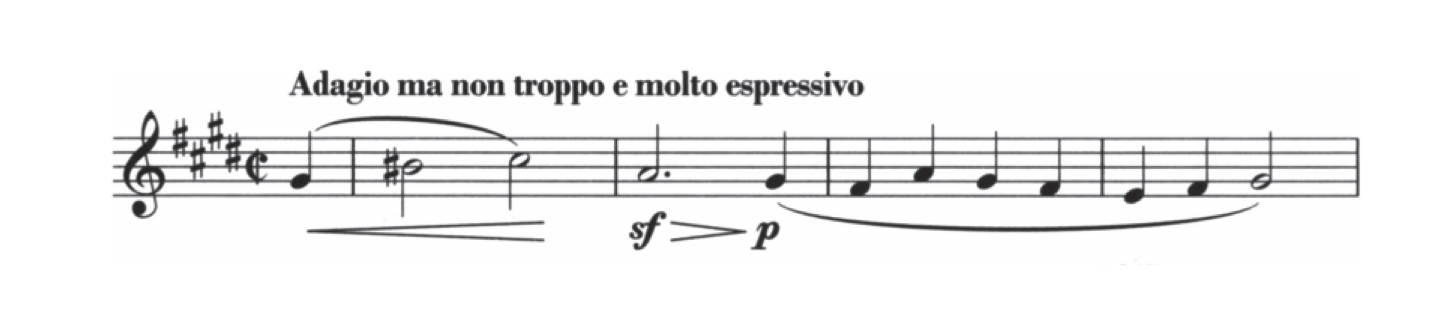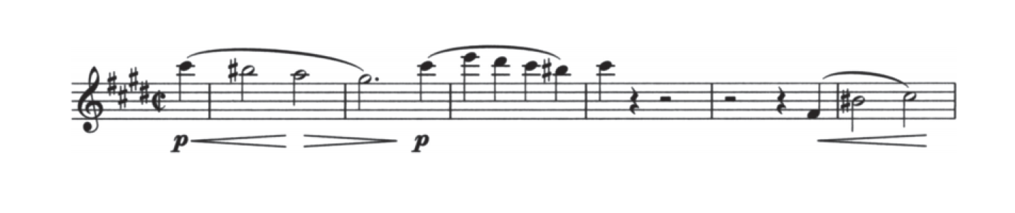 同樣重要的是一個(gè)引出規(guī)模龐大的后續(xù)的單音,第2小節(jié)強(qiáng)拍上加重的空弦A音。它奠定了A大調(diào)在四重奏中的重要性——以及D大調(diào),D音是第二小提琴答題中的重音。在開(kāi)頭小節(jié)中,A和D都是令人心碎的。主題的第二次進(jìn)入并非在通常的屬調(diào)升G,而是在升F小調(diào)、下屬調(diào)以及A大調(diào)的關(guān)系小調(diào)上。升F小調(diào)是第一樂(lè)章中另一個(gè)重要的調(diào)性,在四重奏結(jié)尾,升F和升C仍在競(jìng)爭(zhēng)。整首樂(lè)曲的調(diào)性就像是單一一個(gè)樂(lè)章一樣統(tǒng)一。