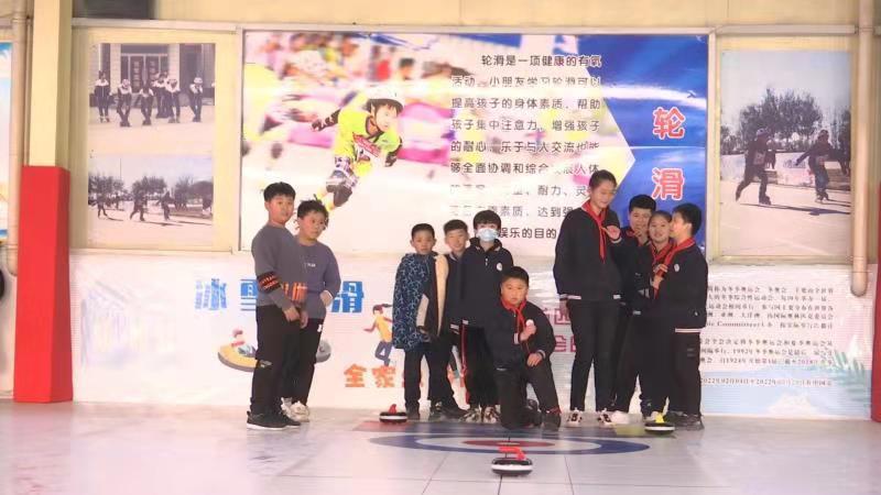 棗強(qiáng)縣第四小學(xué)的學(xué)生們一起練習(xí)陸地冰球。朱亞培 攝