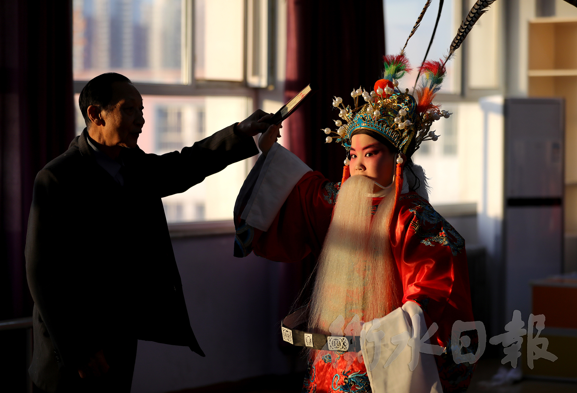 肖世明和陳榮段在給學生演示《紅娘》唱段。
